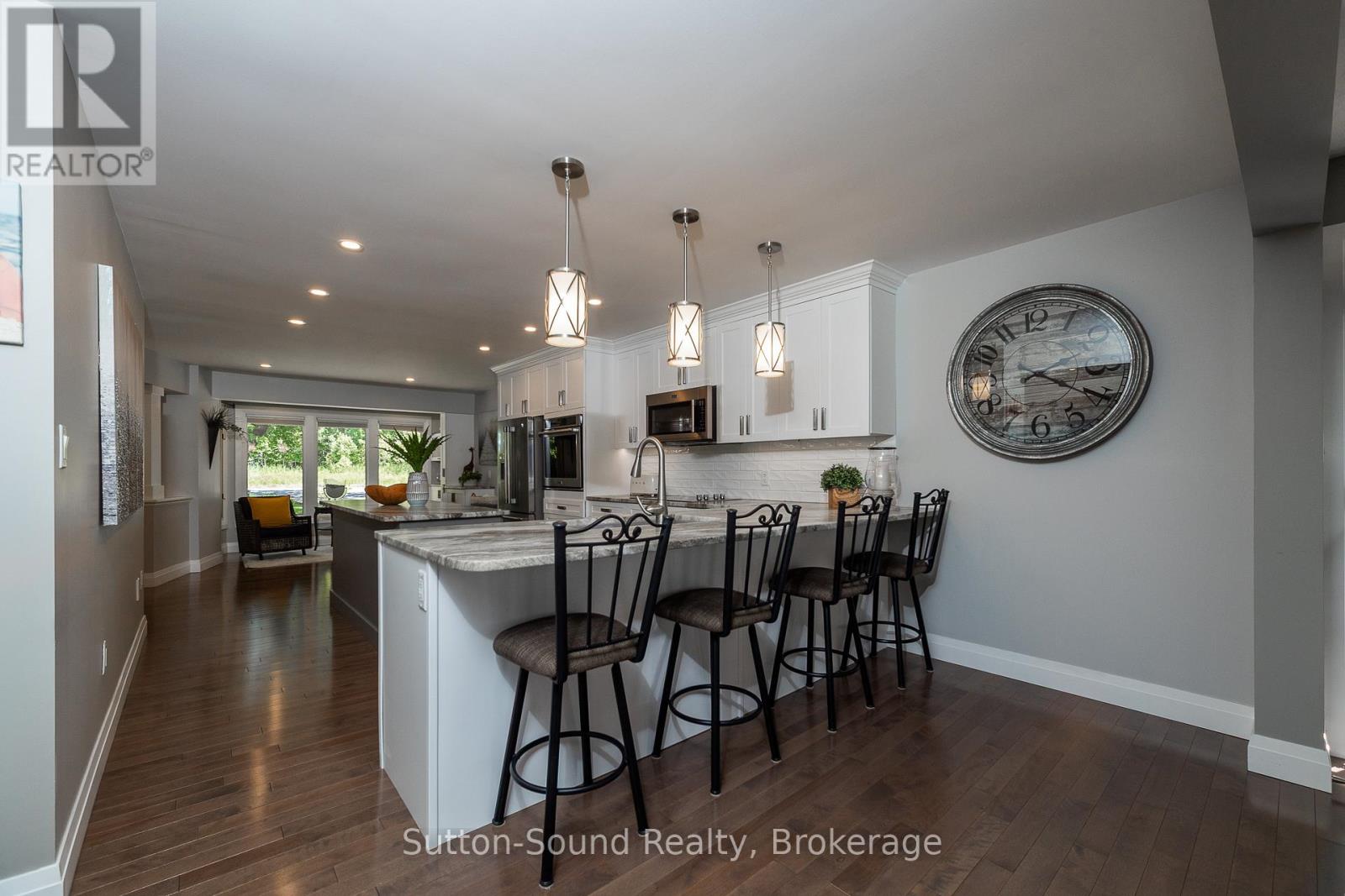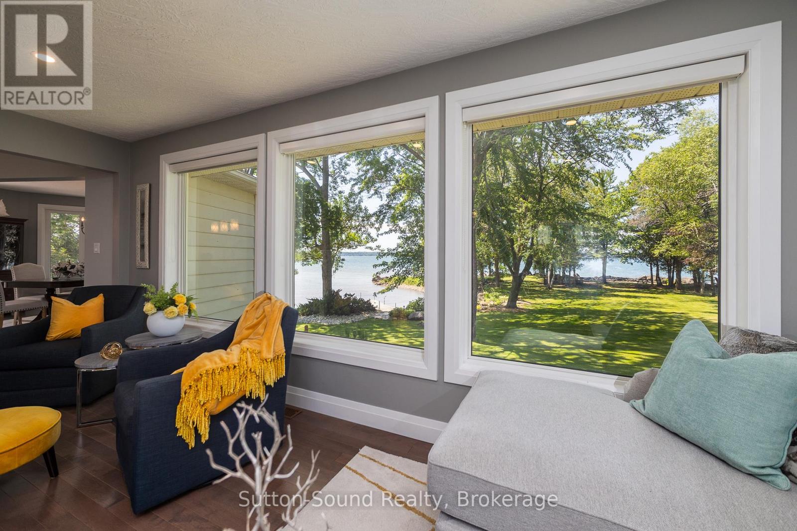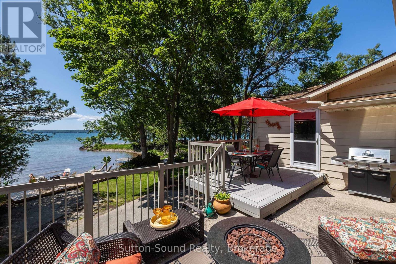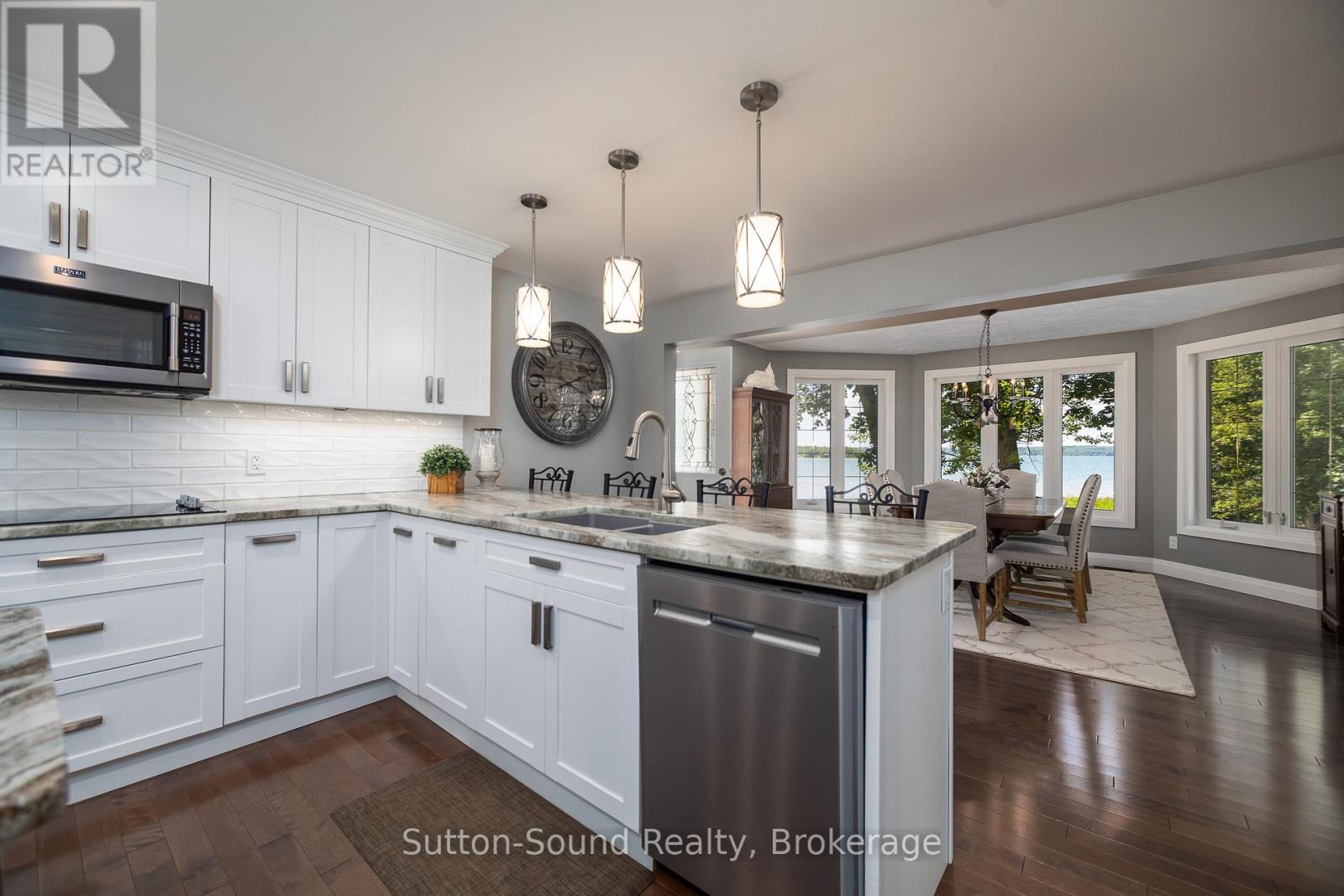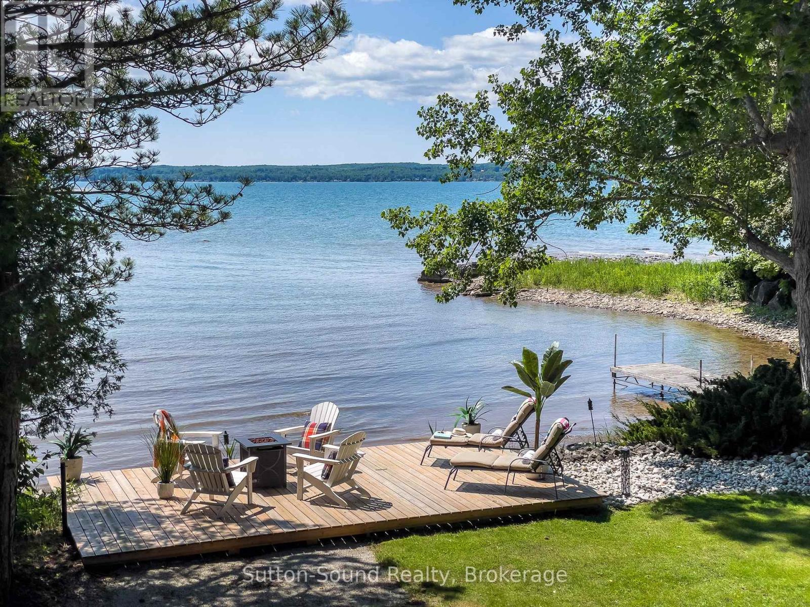 Welcome to 359288 Grey Rd 15, a beautifully updated Georgian Bay waterfront retreat just minutes from Owen Sound. This impeccably maintained 4-bedroom, 3 bathroom bungalow with attached garage offers over 400 ft of pristine shoreline, and is nestled on a sprawling, beautifully landscaped 0.65 acre lot with panoramic views and unforgettable sunsets. Designed with both comfort and sophistication in mind, the main level features a spacious, open concept eat-in kitchen complete with a granite island- ideal for entertaining- flowing seamlessly into a stunning dining room addition with expansive windows that frame the captivating waterfront. The main floor also hosts a powder room, living room with gas fireplace, two generously sized bedrooms and a spa-inspired bathroom showcasing exquisite tilework and glass walk-in shower. Energy-efficient ground source heating ensures year-round comfort. The fully finished lower level, with its own private entrance, offers exceptional versatility- perfect for extended family or guests- featuring a second dine-in kitchen with quartz countertops, a welcoming living room with electric fireplace, two additional bedrooms, and a beautifully appointed 4-pc bath with soaking tub and tiled shower. Step outside and the multiple entertaining areas, a spacious dock, and thoughtfully designed spaces invite you to relax and enjoy the very best of refined waterfront living. (id:4069)